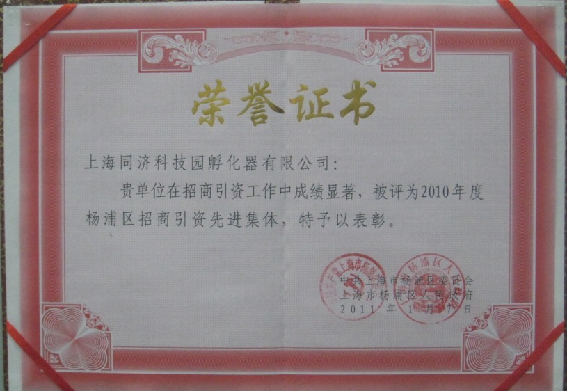 在2010年度杨浦区招商引资先进集体的评选中,同济科技园招商部成绩显著,被中央上海市杨浦区委员会及上海市杨浦区人民政府及授予荣誉证书,这是同济科技园招商部自2004年以来连续第7年度荣膺该项荣誉,是对招商部工作的极大肯定及鼓励。