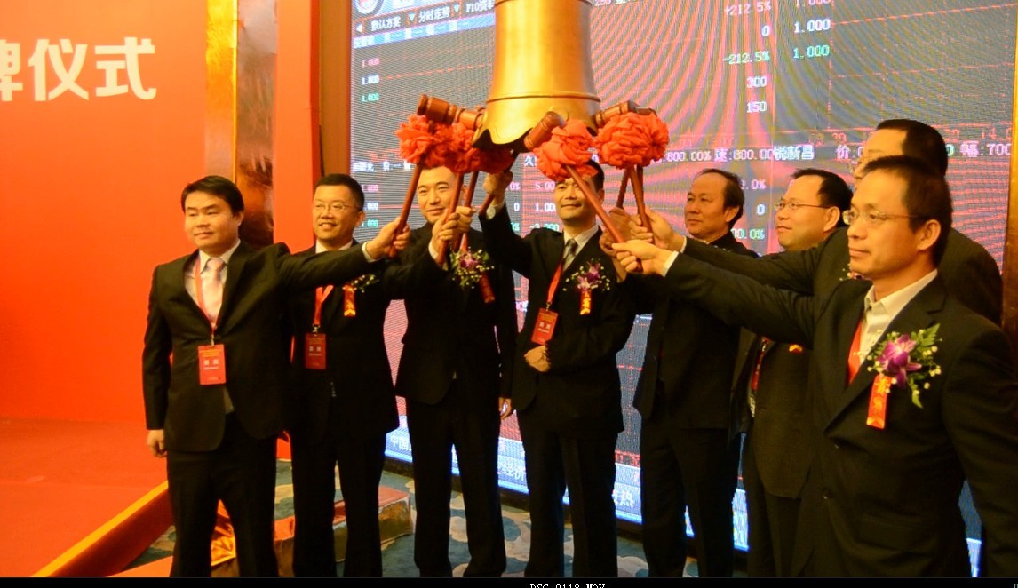 企业负责人在挂牌仪式上集体敲钟,左一为新眼光董事长兼总经理汤德林