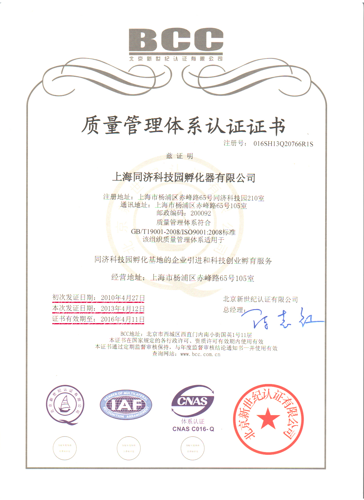 我公司在连续三年有效运行ISO质量管理体系之际,迎来了第三次监督审核,并鉴于获取的质量管理体系证书于2013年4月26日到期,再认证工作与监督审核一并于3月16日、17日接受了北京新世纪认证有限公司(BCC)对公司质量管理体系的全面检查,顺利通过现场审核以及资料评定,于4月12日成功获得BCC质量管理体系认证,这标志着公司质量管理体系三年来完善、有效,满足GB/T19001-2008/ISO9001:2008标准的要求,对同济科技园孵化基地的企业引进和科技创业孵育服务有着重要的指导作用。