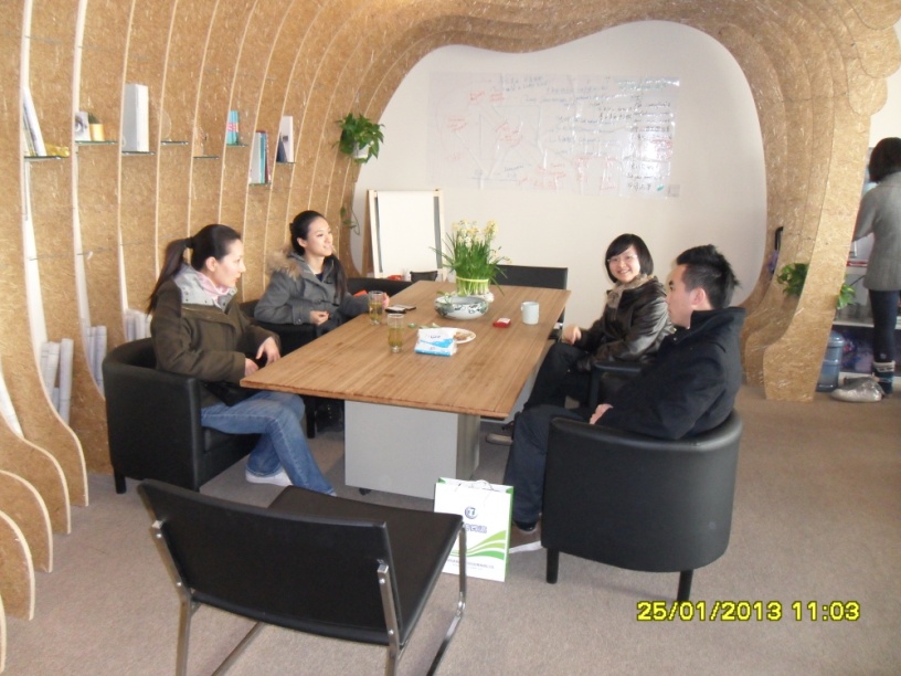 图为:2013年2月同迹新材料向曼氏建筑推广新型户外建筑材料“氟碳木纹铝”