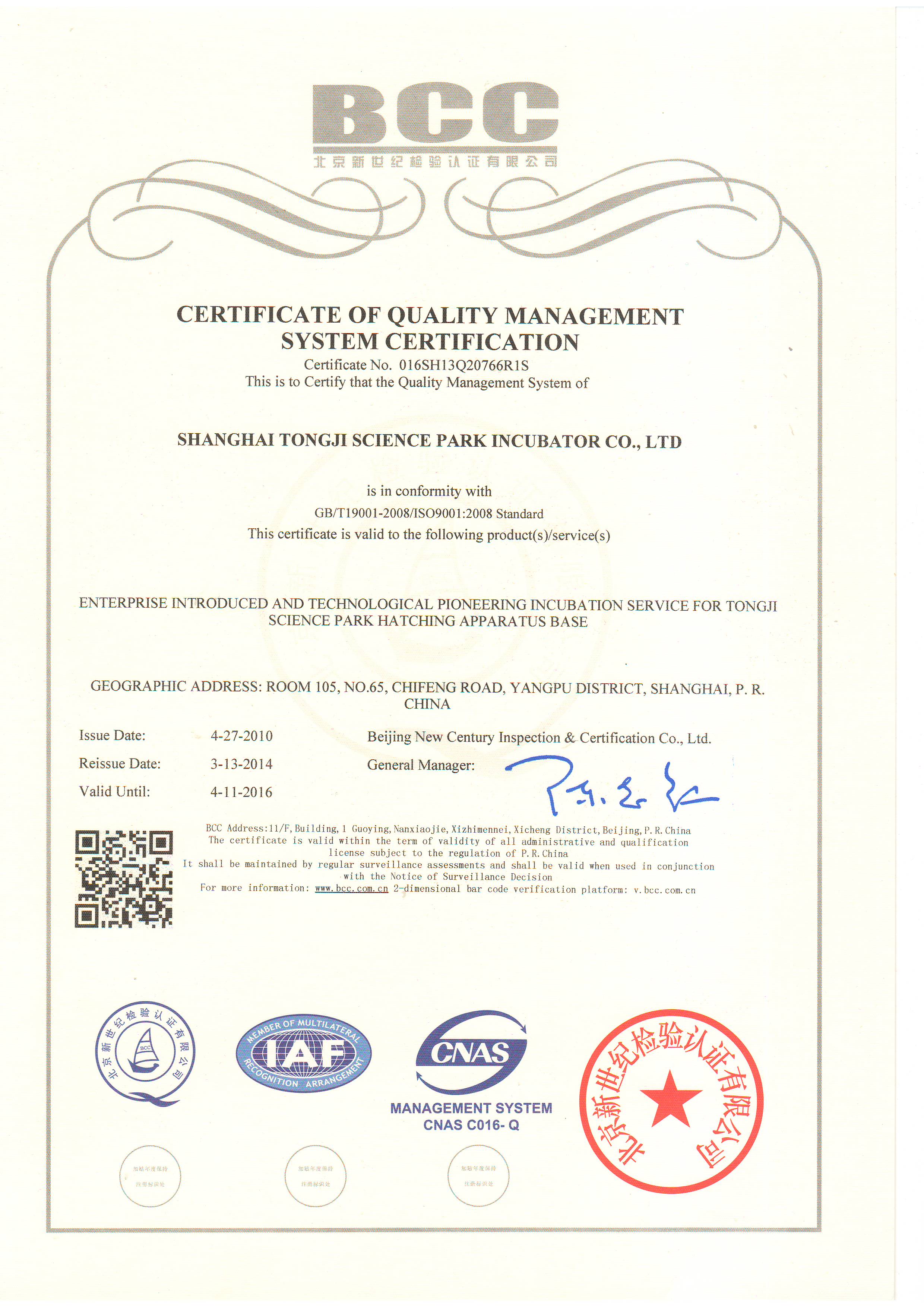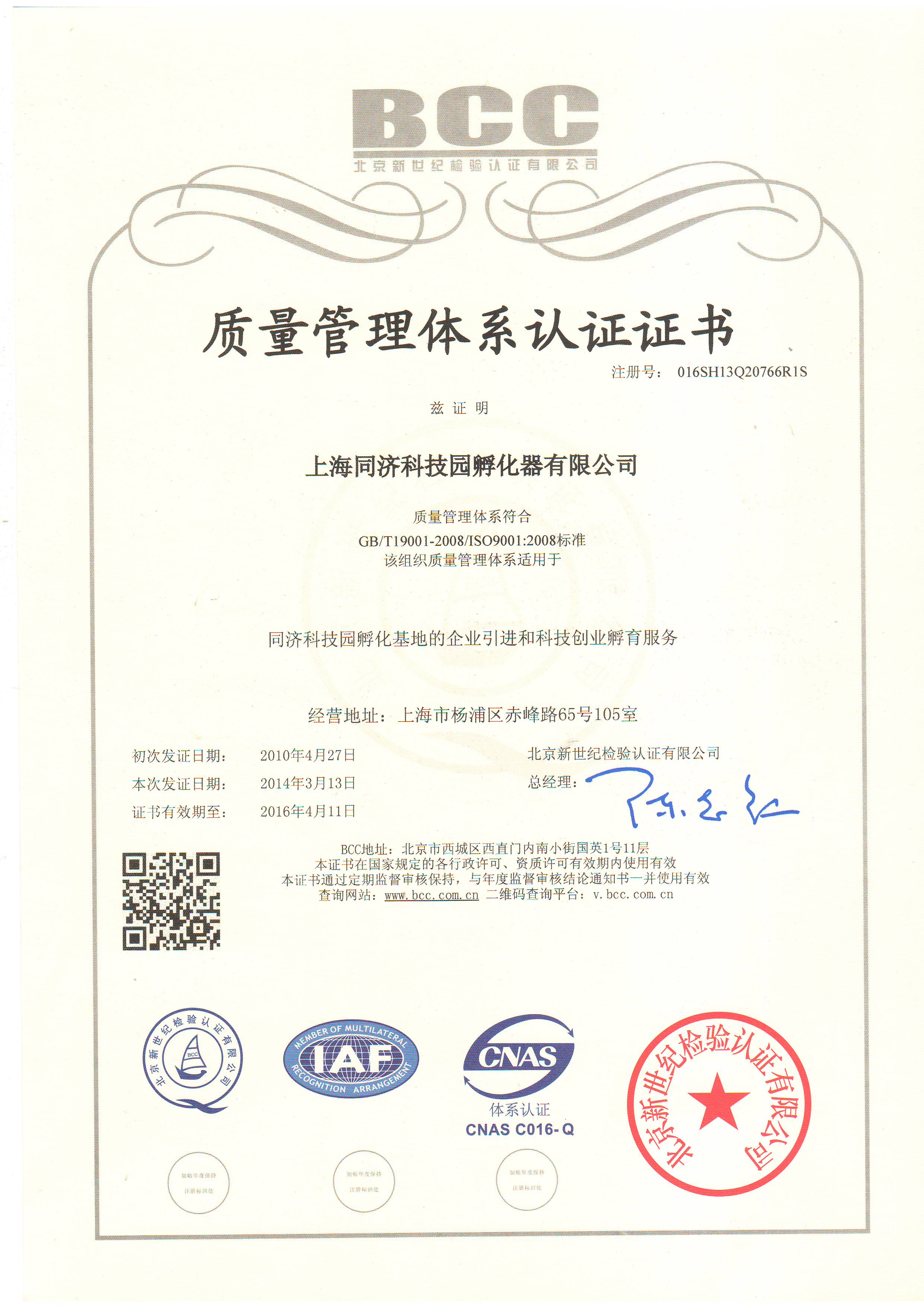 近期,在赤峰路基地202会议室,我司接受了来自北京新世纪检验认证有限公司(以下简称:BCC)对公司质量管理体系的全面检查,在为期一天半的评审中,两名高级审核员对公司在同济科技园孵化基地的企业引进和科技创业孵育服务方面进行了严格而全面的审核,我司成功通过了第四次监督评审,并于3月13日获得BCC质量管理体系认证监督审核结论通知,同意继续保持认证注册资格。