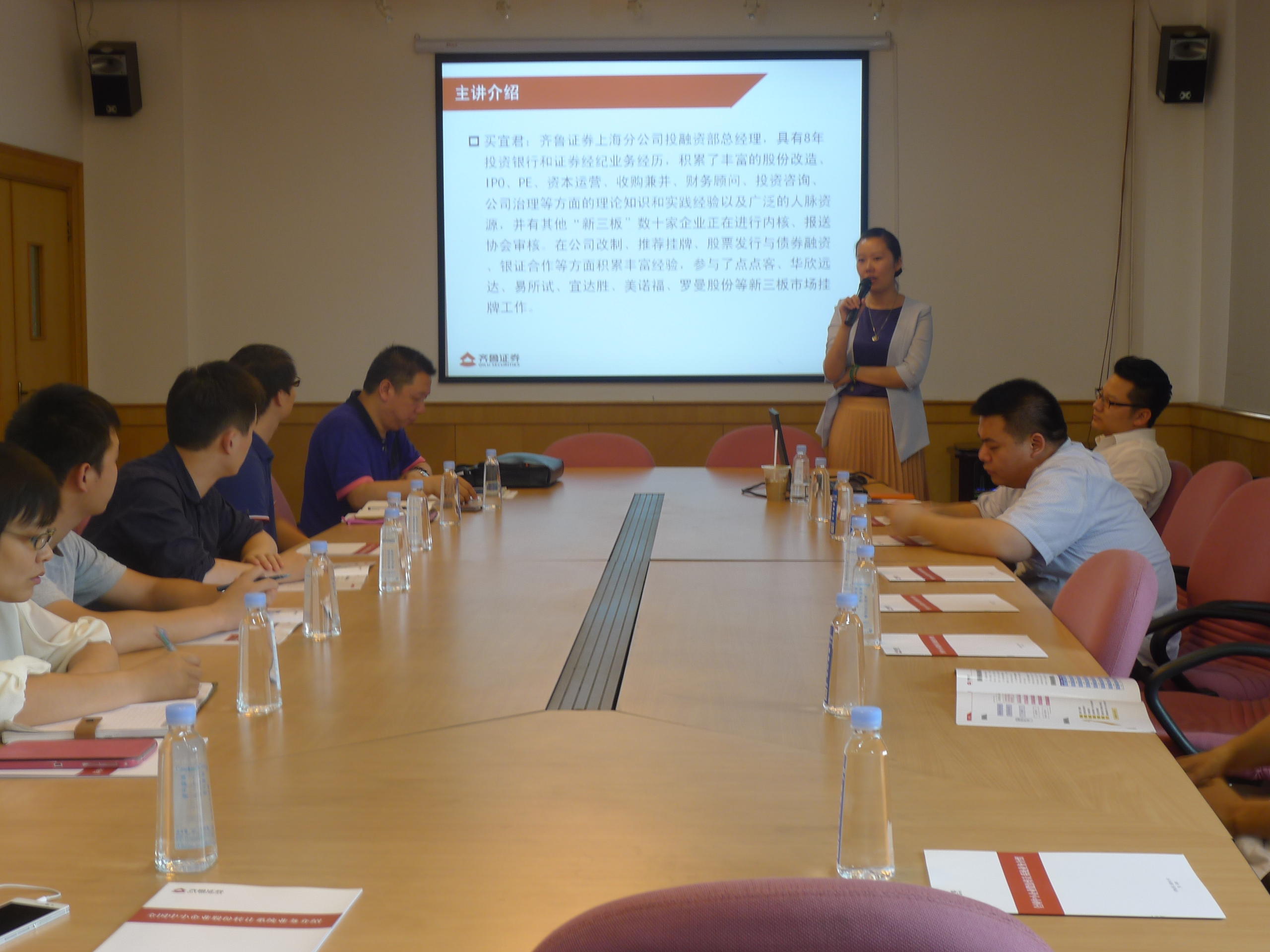 课上,买老师从全国股份转让系统历史沿革、场外市场重大历史机遇开始讲解,逐步延伸至全国股份转让系统的主要制度、做市商制度、中小企业发展过程中面临的问题、新三板促进企业融资功能的发挥、企业挂牌的整体工作安排等,内容由浅入深,全面细致,语言通俗易懂,注重实务。课后,企业与老师互动交流热烈,培训取得了很好的效果。