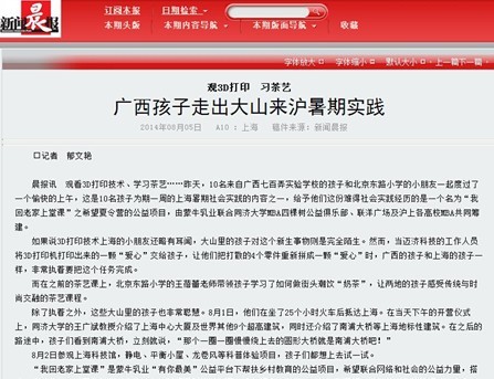 近日,10位来自广西七百弄实验学校的瑶族学生和上海北京东路小学的学生们,共同上了两堂有趣的社会实践课。本次活动是由蒙牛乳业与同济大学MBA“四棵树”公益俱乐部联合主办,特邀广西七百弄实验学校10位品学兼优的瑶族学生,到上海进行为期一周的“西望夏令营”活动。在志愿者的带领下,来自广西的学生们参观了中国馆、科技馆、杜莎夫人蜡像馆等;同时,我园区企业迈济智能科技(上海)有限公司(以下简称:迈济公司)作为协办单位亦为学生们呈现了精彩的3D打印科技,力求通过科技展示,让广西山区的学生们开阔视野,促使他们真正理解读书的目的和意义。