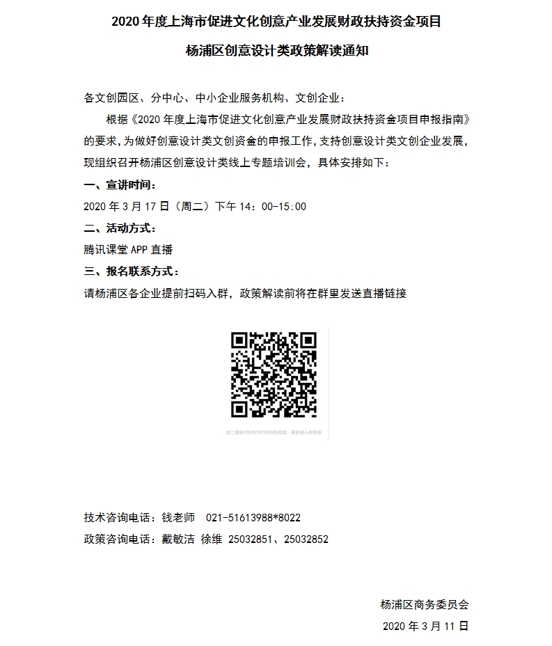 2020 年度上海市促进文化创意产业发展财政扶持资金项目杨浦区创意设计类政策解读通知
