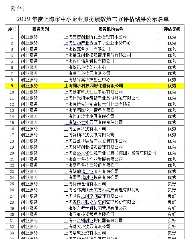 根据《上海市经济信息化委关于开展2019年中小企业服务第三方绩效评估工作的通知》(沪经信企〔2019〕731号)的要求,上海市促进中小企业发展协调办公室组织开展了2019年度上海市中小企业服务绩效第三方评估工作,在本次服务绩效评估工作中上海同济科技园孵化器有限公司获创业服务机构优秀排名!