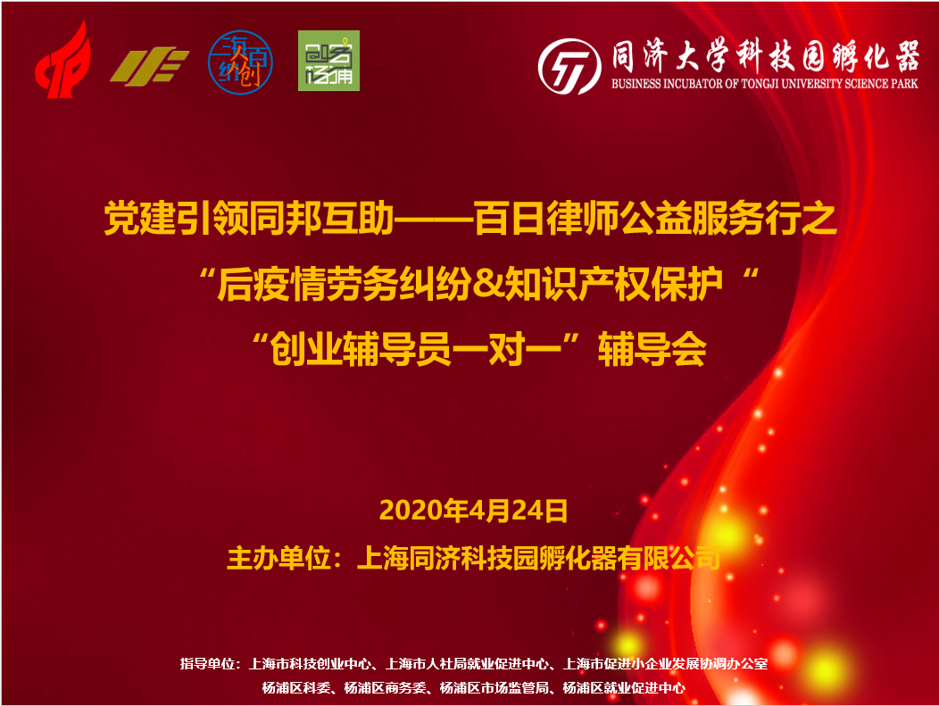 党建引领同邦互助——百日律师公益服务行之 “后疫情劳务纠纷&知识产权保护” “创业辅导员一对一”辅导会在同济科技园孵化器基地成功举办
