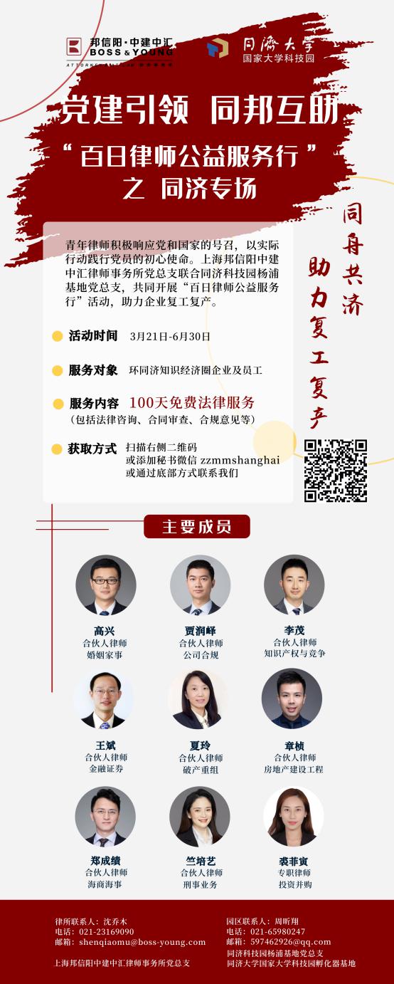 此次“百日律师公益服务行”专场活动,服务对象为环同济知识经济圈企业及员工,服务内容包括法律咨询、合同审查、合规建议、刑事咨询等,帮助企业及员工在疫情时期正确掌握有关劳动法、知识产权、竞争与反垄断、公司与并购、合规与监管、建筑工程、环境环保、设计传媒、国际贸易、投融资、IPO、破产重组、税法、银行与金融、婚姻家庭、家族财富与传承、刑事合规、争议解决(诉讼与仲裁)咨询等方面的法律知识,减轻疫情对企业及员工造成的不利影响,避免可能出现的法律风险。律师服务团汇聚线上互动交流,多方合力为企业及员工远程支着、在线答疑,还可化身“主播”,线上“面对面”为大家排忧解难。